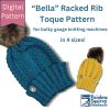 “Bella” is quick, easy, and a great way to use up a single 85g skein of worsted weight yarn. Knit one up for every member of the family. The interesting texture in the main section of the hat is created using a racked rib pattern that is explained in detail. “Bella” contains no shaping, making it simple for even beginner machine knitters.