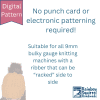 • Bulky gauge (9mm) machine with a ribber that can be racked side to side. You do not need patterning capabilities for this racked rib pattern.
